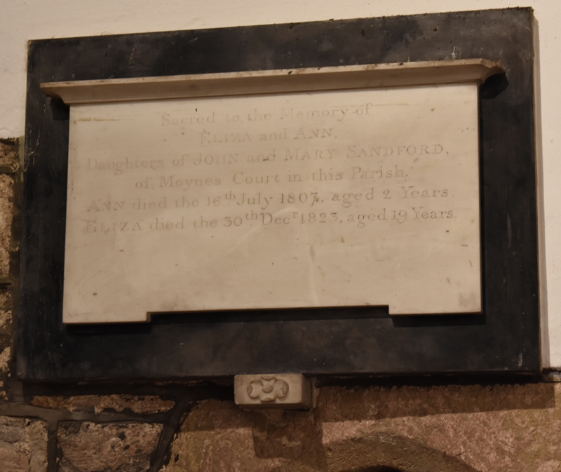 Sacred to the memory of Eliza and Ann, daughters of John and Mary Sandford of Moynes Court in this Parish. Ann died the 16th July 1807 aged 2 years. Eliza died the 30th Dec 1823 aged 19 years
